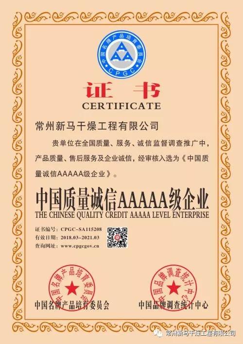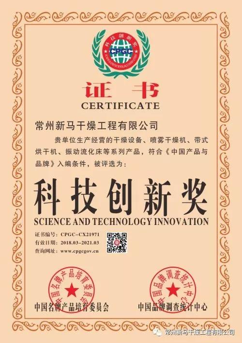 與此同時, 由中國名牌產品培育委員會、中國品牌調查統計中心認證的“全國重合同.守信用企業”“中國質量誠信AAAAA級企業”品質鑒定。經過產品市場考察、專業評審等嚴苛環節,常州新馬干燥工程有限公司順利通過調研評估。公司憑借主營干燥設備:噴霧干燥機、帶式烘干機、振動流化床等系列產品,斬獲“科技創新獎”此項殊榮。